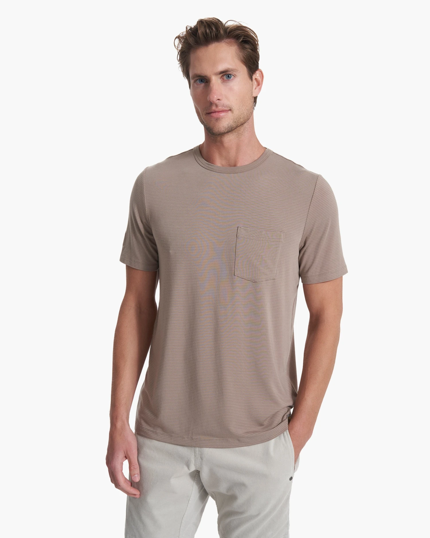 A performance knit striped t-shirt is always an ideal go-to. Our Linear Tee brings the comfort, with 4-way stretch, moisture wicking, odor protection, and a convenient front pocket, making it great for yoga, training, and running.